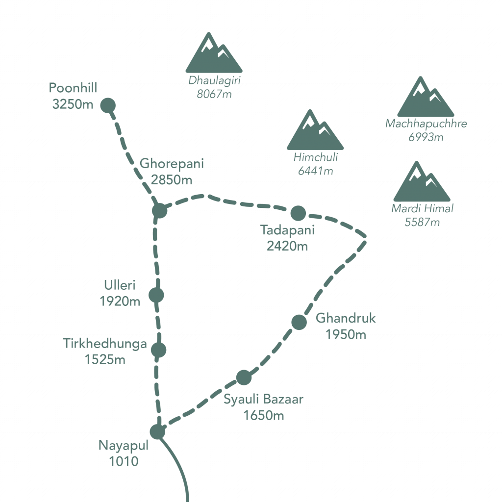 Durant cet itinéraire vous traverserez des forêts de rhododendrons, des champs en terrasses et des villages Népalais. Le but ultime de ce trek est de voir le fameux lever de soleil sur la chaine des Annapurnas. Aux pieds de l’Himalaya vous découvrirez les chaines des Annapurnas, dominée par la présence imposante de l’Annapurna South.